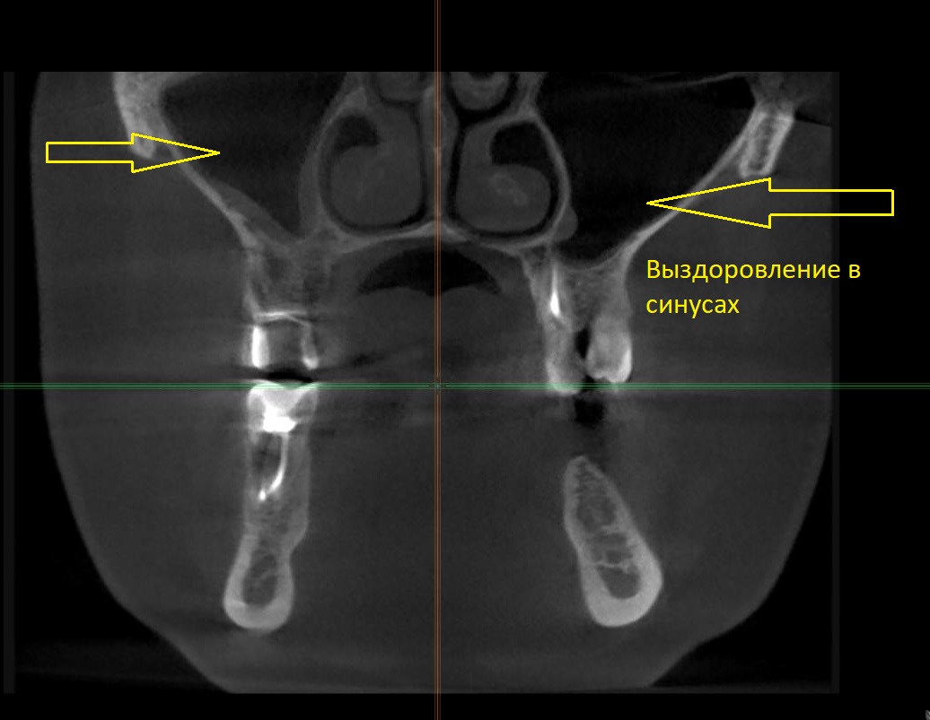 Нами было проведено повторное эндодонтическое лечение проблемных зубов.Через 6 месяцев видны отличные результаты заживления воспалительных изменений на верхушках корней, а также устранение воспаления в верхнечелюстной пазухе( гайморита).