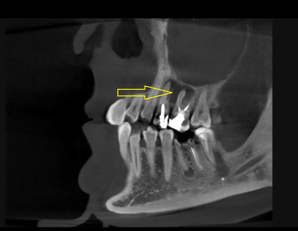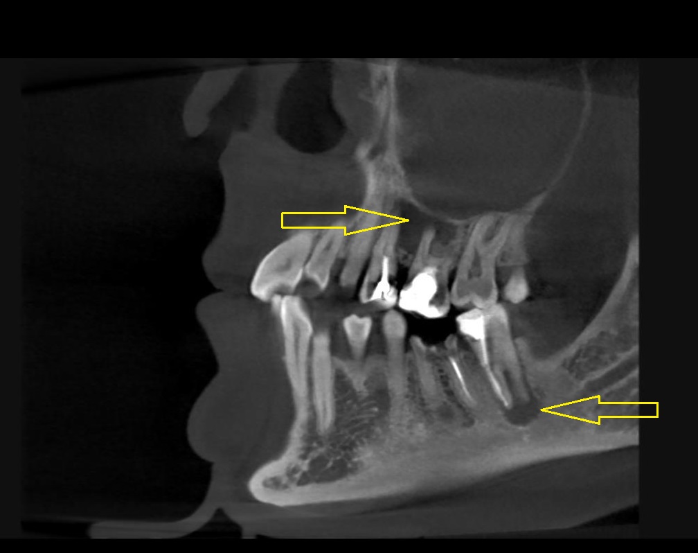 Ранее пациентка консультировалась у ЛОР-специалиста и нескольких стоматологов из других клиник- пациентке был предложен единственный вариант лечения, связанный с удалением двух проблемных зубов с воспалительным процессом на верхней челюсти , плюс проведение консервативного ЛОР лечения. Пациентка с вариантом удаления двух зубов не согласилась и обратилась к нам в клинику. После проведения диагностических мероприятий было установлено наличие обширных воспалительных процессов на двух зубах на верхней челюсти, а также на нижнем зубе.