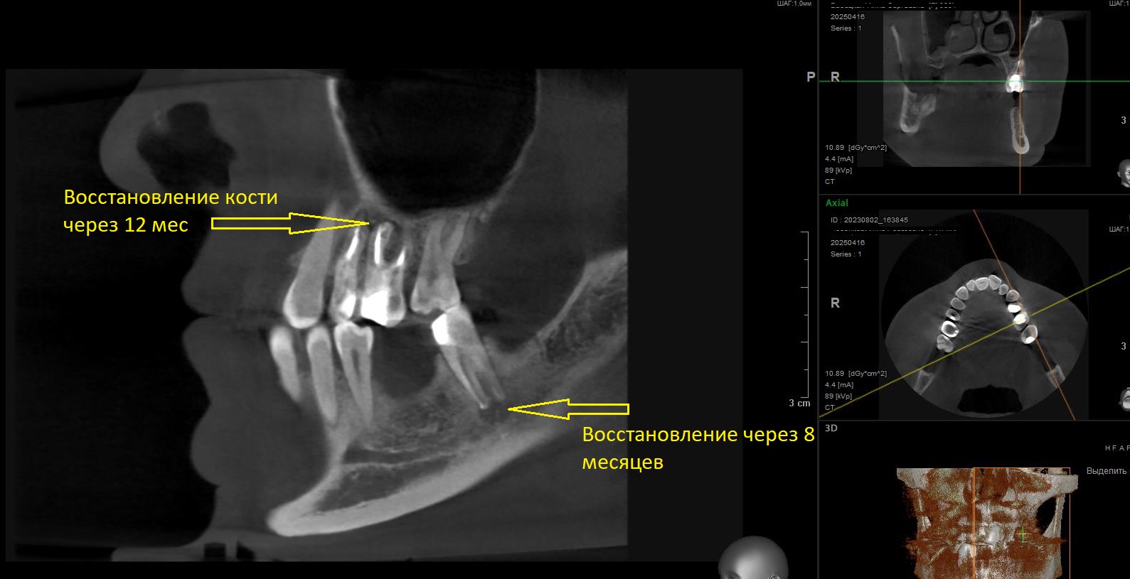 Нами было проведено повторное эндодонтическое лечение проблемных зубов.Через 6 месяцев видны отличные результаты заживления воспалительных изменений на верхушках корней, а также устранение воспаления в верхнечелюстной пазухе( гайморита).